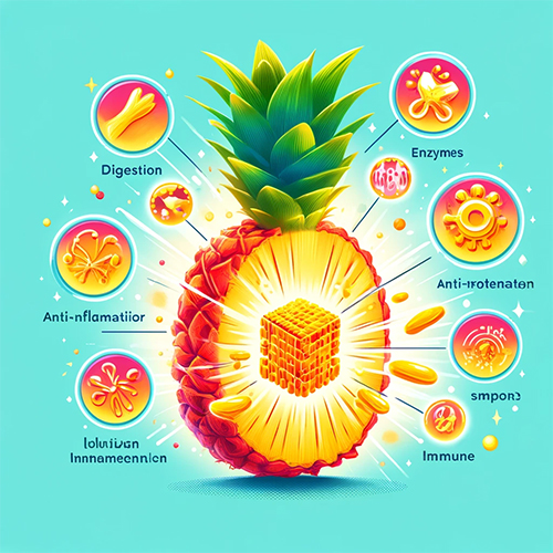 파인애플에 함유된 브로멜라인 효소는 건강에 여러 가지 이점을 제공합니다. 첫째, 이 효소는 소화를 돕고 소화 불량을 완화하는 데 큰 도움을 줍니다. 특히 단백질이 풍부한 식사 후 섭취할 경우, 브로멜라인이 단백질을 분해하여 소화 과정을 촉진시킵니다. 이로 인해 불편한 소화 불량이나 팽만감을 줄일 수 있습니다.